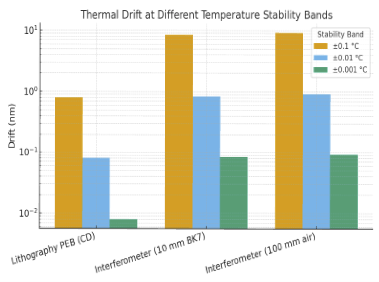 For example, at a standard cleanroom tolerance of 23 °C ±0.3 °C, a 6-inch quartz mask can expand or contract by more than ±20 nm across its edge — already exceeding placement error budgets for next-generation lithography. Even at ±0.1 °C stability, mask drift is on the order of ±7.6 nm, which cannot be ignored in sub-3 nm technology nodes.